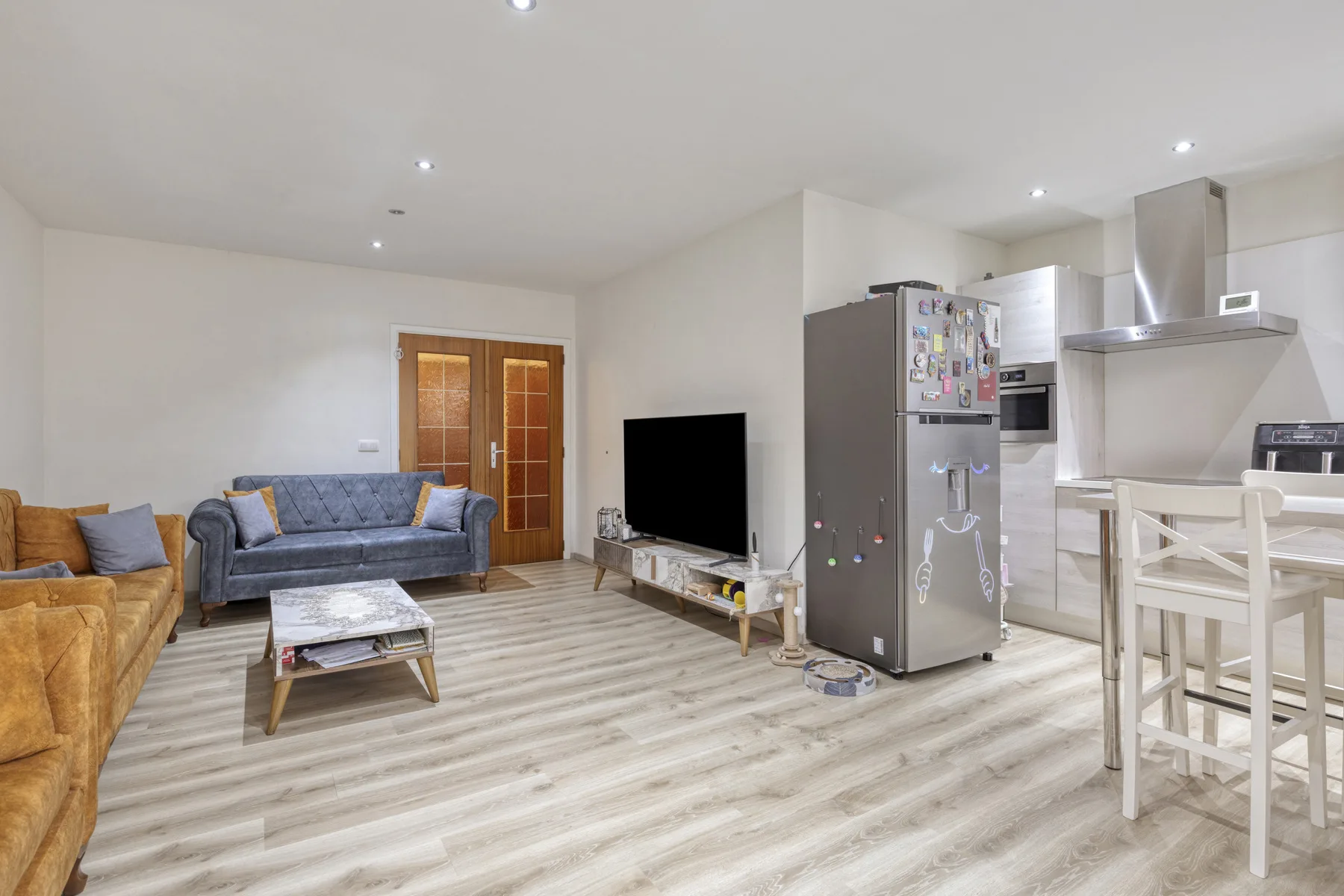 Via de inkomhal betreedt u de lichte en ruime leefruimte met laminaatvloer, waar de grote raampartijen zorgen voor een aangename lichtinval. Aansluitend bevindt zich de volledig geïnstalleerde open keuken, uitgerust met een keramisch kookvuur, oven, ijskast, afwasmachine en voldoende opbergruimte.