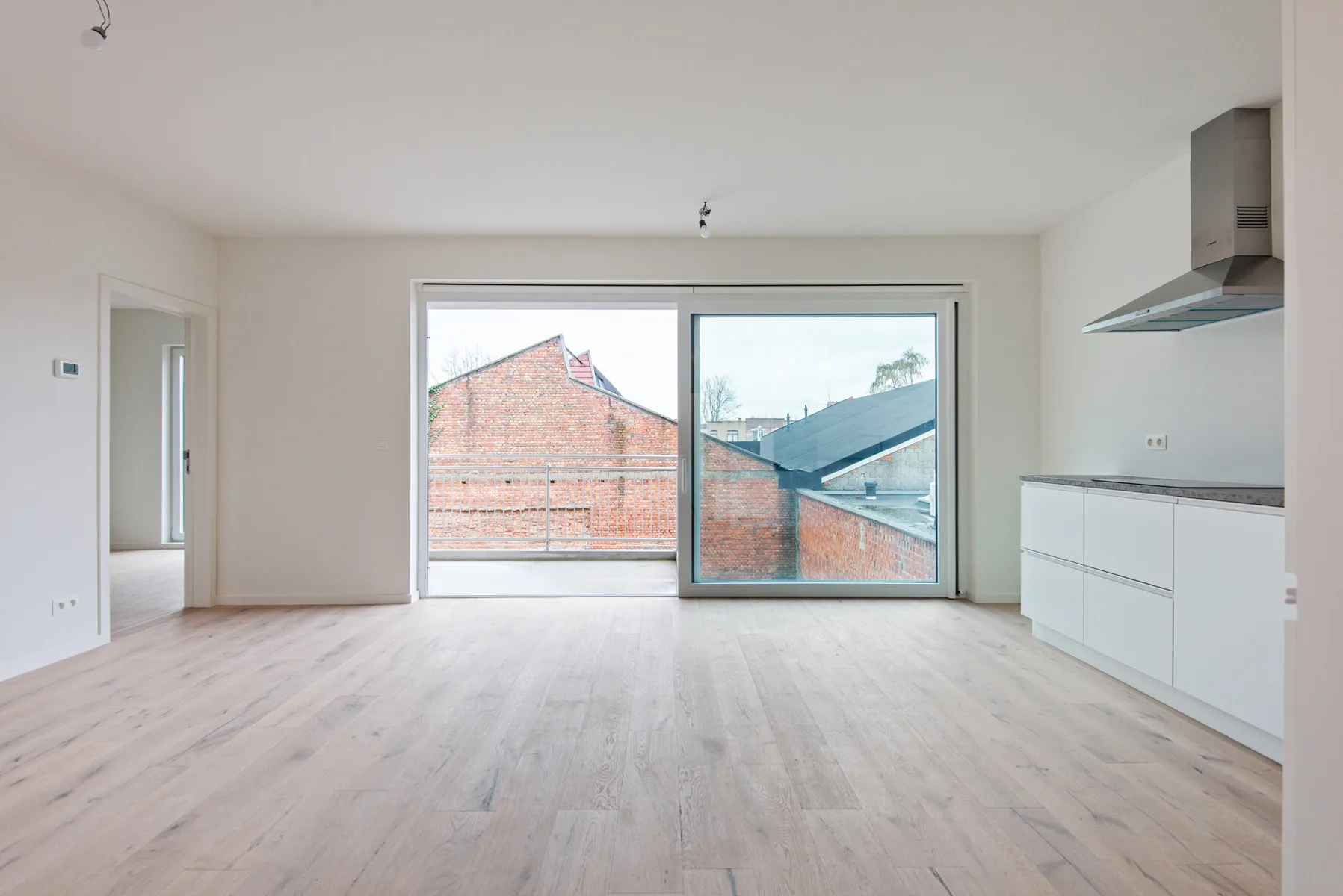 U betreedt het appartement via de inkomhal die uitgeeft op de gezellige leefruimte op parket met open keuken. Dankzij de grote raampartijen geniet u hier van een aangename natuurlijke lichtinval en een rechtstreekse toegang tot het leuke terras. De open keuken is volledig uitgerust met inductiekookplaat, oven, microgolf, vaatwasser, ijskast en voldoende opbergruimte.