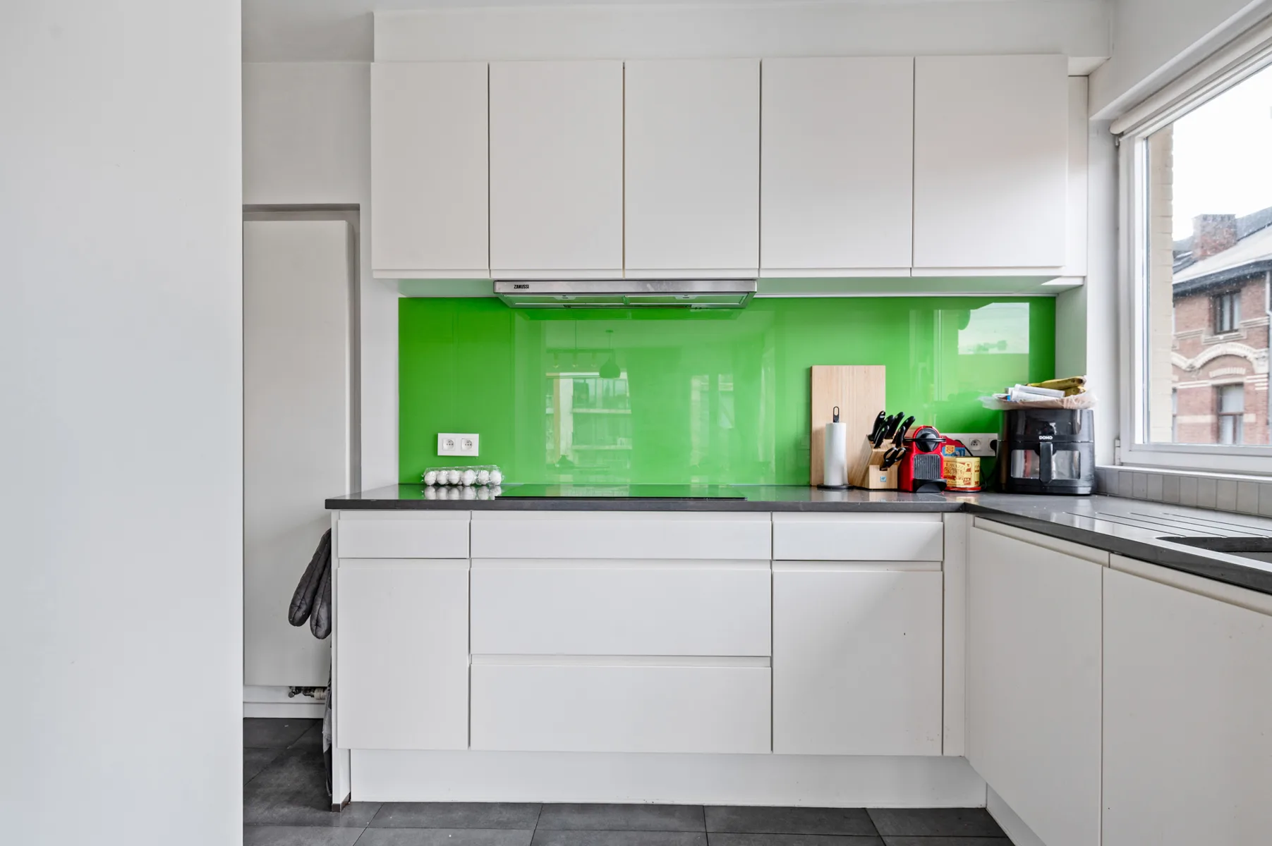 Dit appartement is gelegen op de derde verdieping van een kleinschalig gebouw. Via de inkomhal betreedt u de ruime leefruimte van ca. 32 m², waar de hoekligging en brede raampartijen zorgen voor een overvloed aan natuurlijk licht en zicht op de prachtige omgeving. De leefruimte biedt voldoende plaats voor een comfortabele zithoek, eetplaats en zelfs een bureauhoek. Aansluitend bevindt zich de open, hedendaagse keuken van ca. 8 m², uitgerust met onder- en bovenkasten, kookplaat, dampkap, oven, koelkast, diepvries, vaatwasser en voldoende werkruimte. Via de centrale hal bereikt u de nachtruimte. Het appartement beschikt over twee slaapkamers van respectievelijk ca. 13 m² en 10 m². De badkamer (ca. 4 m²) is voorzien van een douche, lavabo en toilet.