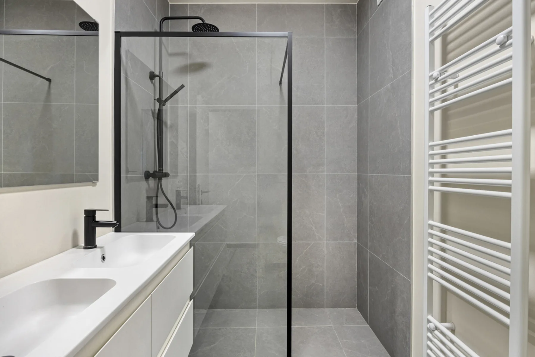 Via de hal aan de achterzijde bereikt u alle overige ruimtes: het inpandig terras met wasberging, de twee volwaardige slaapkamers en de badkamer. Deze laatste is uitgerust met een inloopdouche, toilet, handdoekradiator en een dubbele wastafel met meubel.