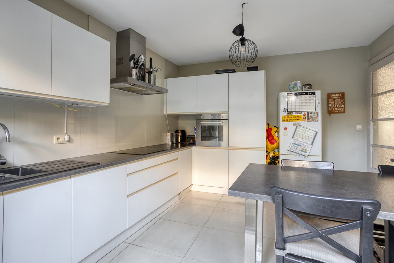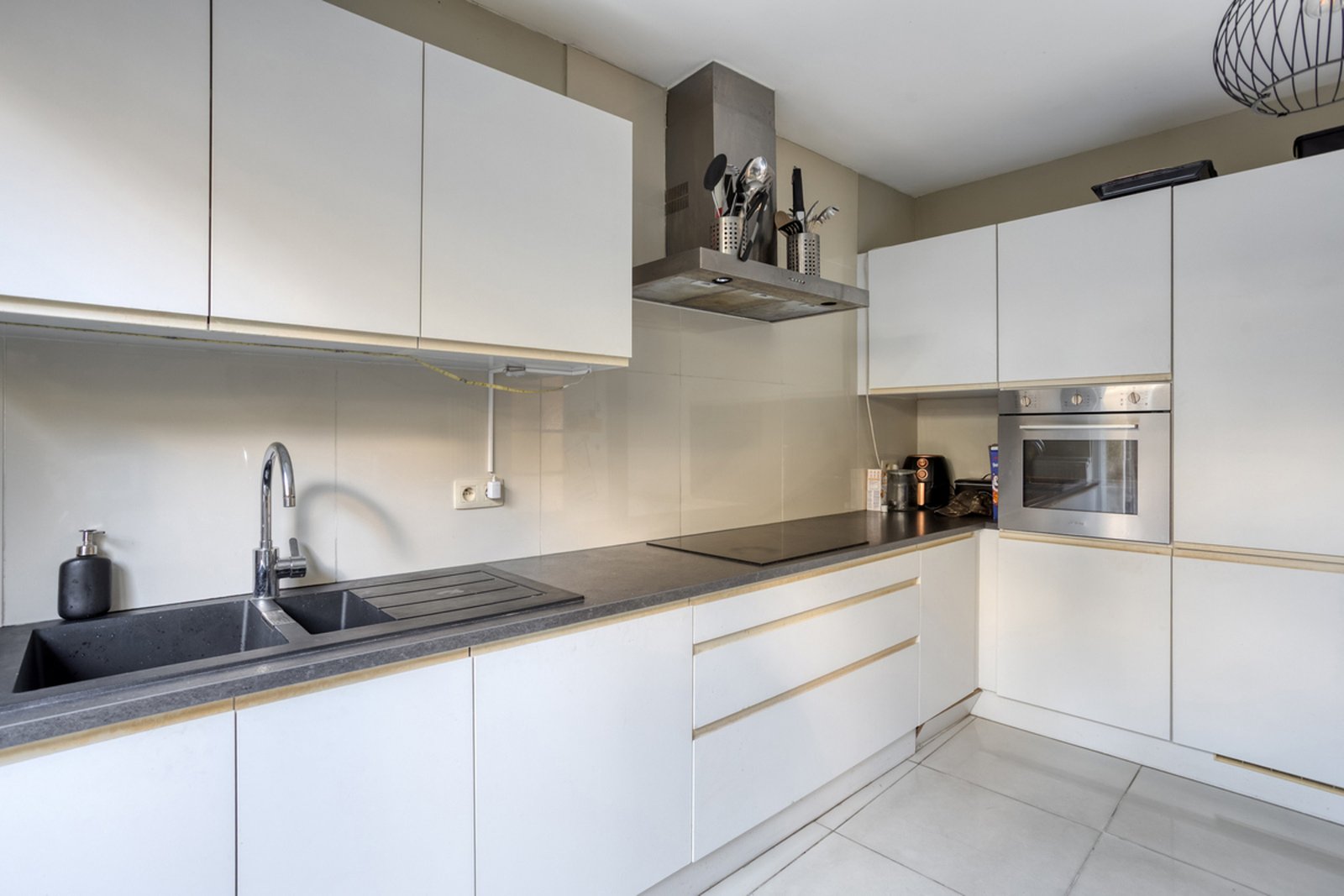 We betreden de woning via de ruime inkomhal die uitgeeft op de lichtrijke leefruimte. Aansluitend bevindt zich de volledig ingerichte keuken, uitgerust met koelkast, diepvriezer, oven, kookplaat, vaatwasser en voldoende opbergkasten. Op het gelijkvloers vinden we bovendien een apart gastentoilet en een eerste slaapkamer.