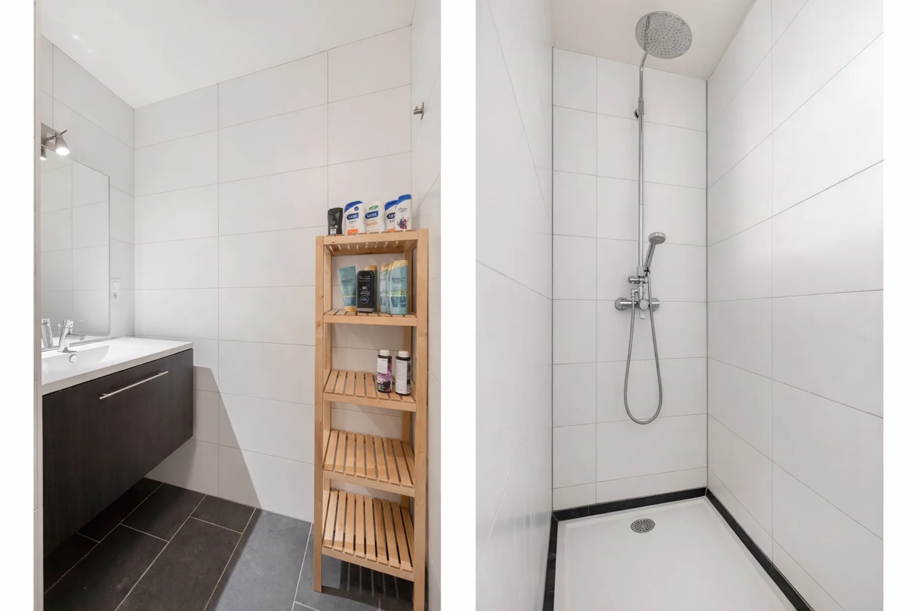 De eerste verdieping omvat twee kamers (16 m² – 13 m²) en een tweede gedeelde badkamer met douche, lavabo met meubel en een apart toilet.