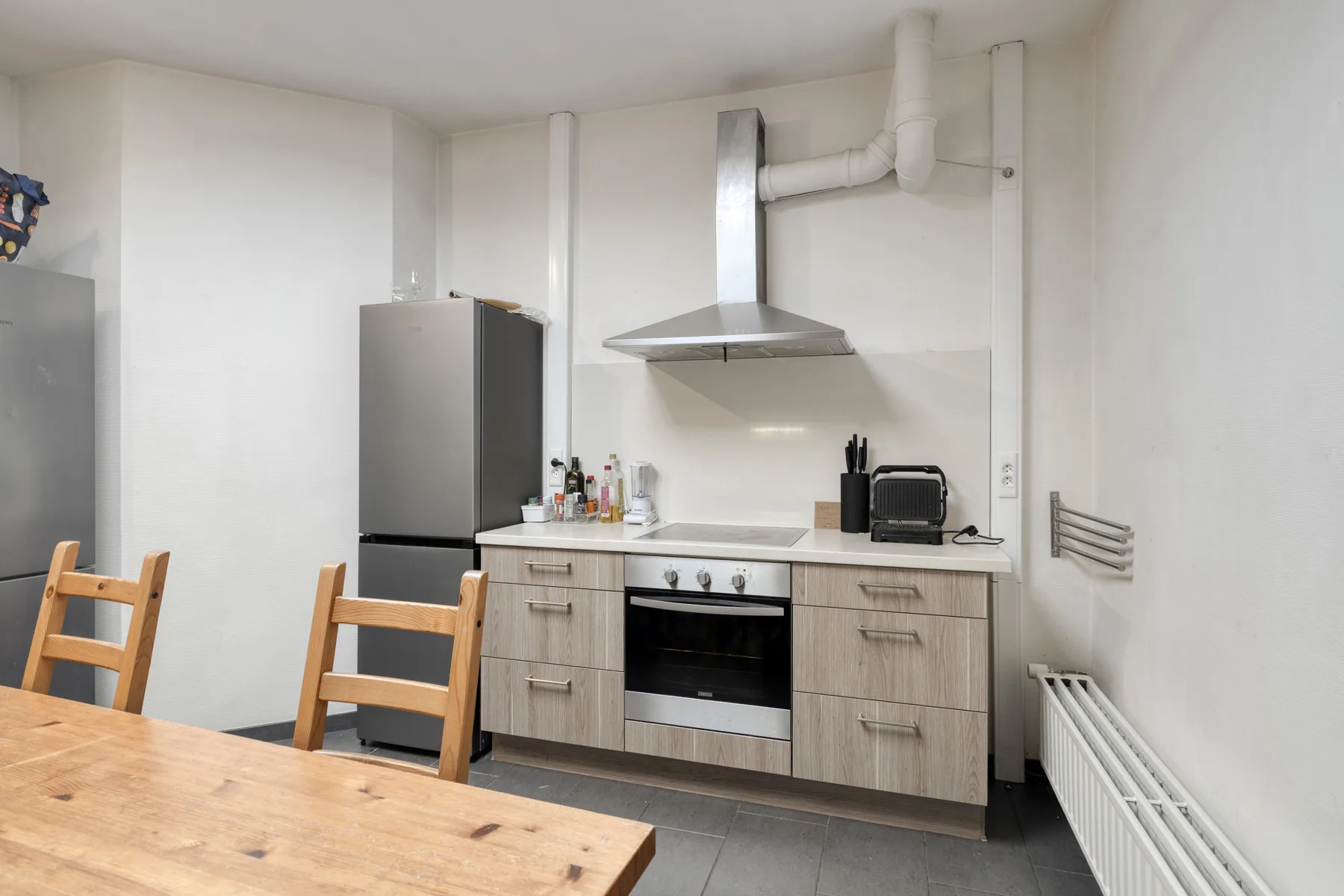 De keuken is volledig geïnstalleerd en uitgerust met een combi-oven, elektrische kookplaat, dampkap, koelkast met vriezer, vaatwasser en een spoelbak.